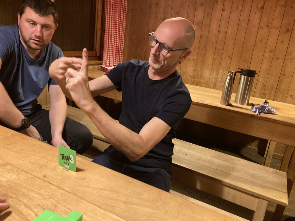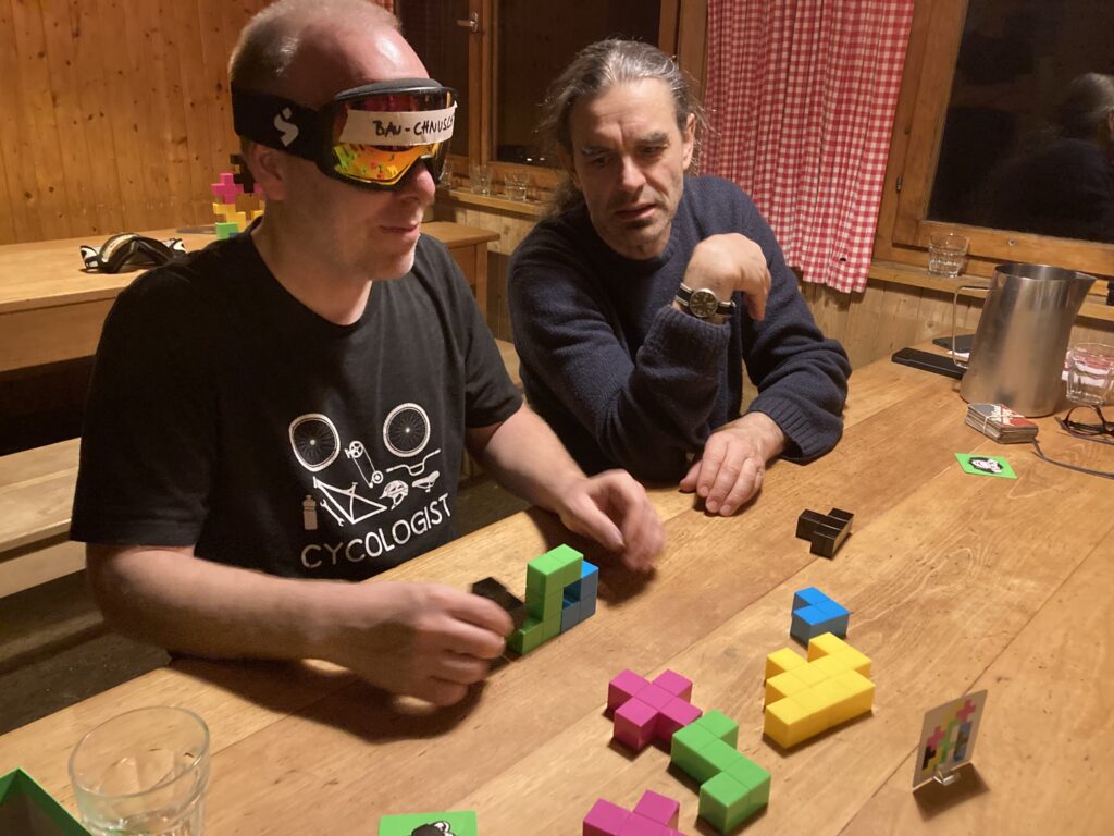Am Abend genossen wir Raclette, bevor ein kniffliges Spiel unsere Teamarbeit forderte: ein stummer Architekt, der alles nur zeigen konnte, und ein Bauleiter, der alles in Worte fassen musste, damit ein blinder Bauchnuschti ein Haus bauen konnte. Drei Runden à drei Minuten – und es wurde immer schwieriger. Die Gruppe mit Ingrid und den Kindern gewann mit beeindruckender Leichtigkeit, sodass wir alt aussahen.